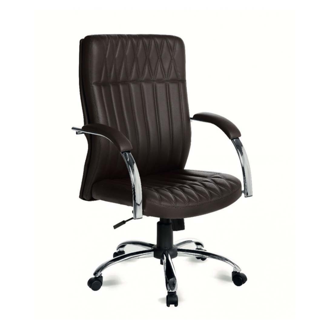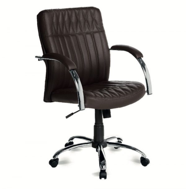 Com braços cromados, apoios em madeira revestida na cor da poltrona.