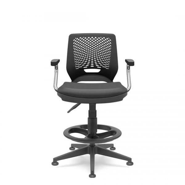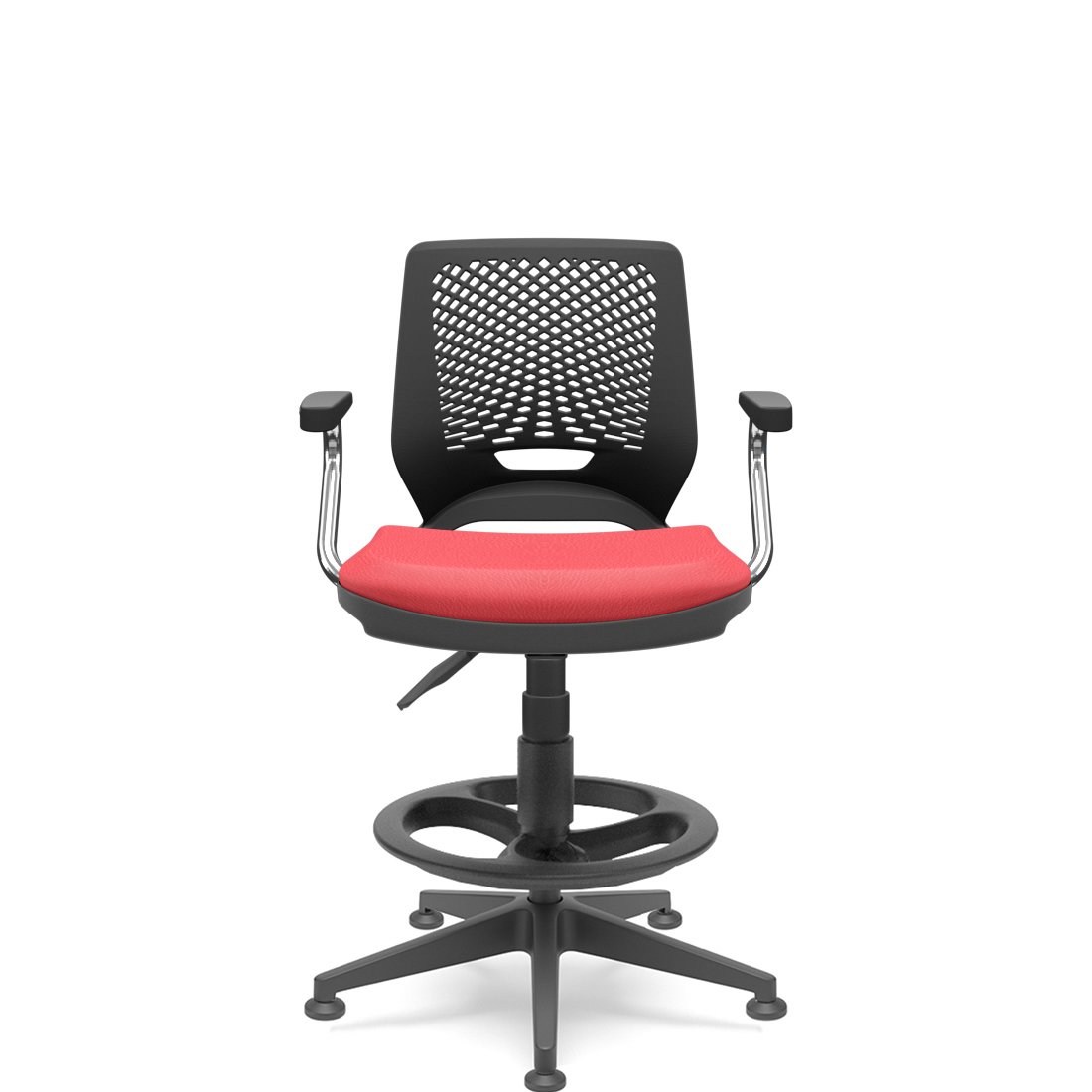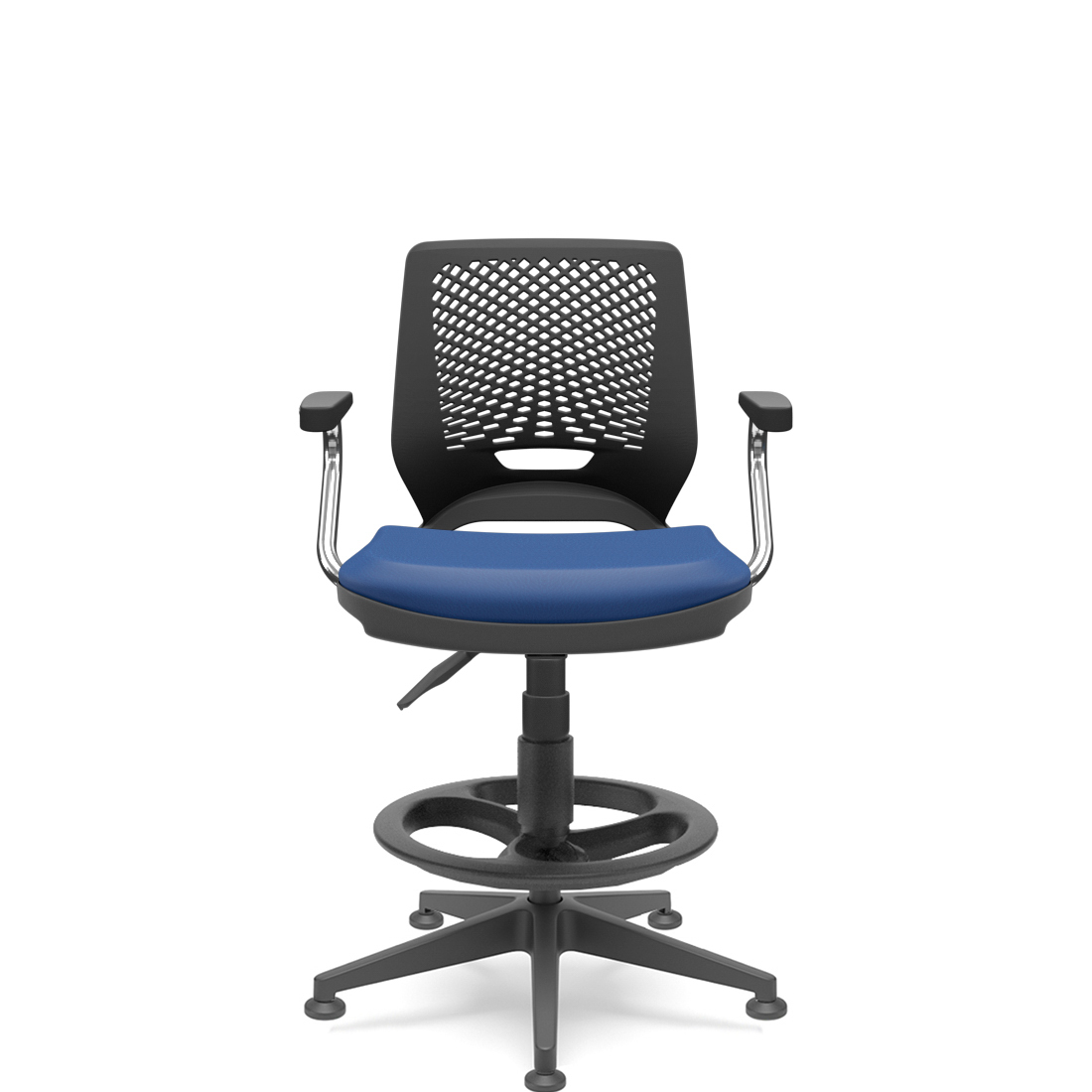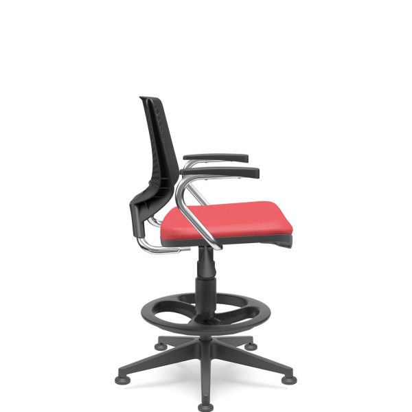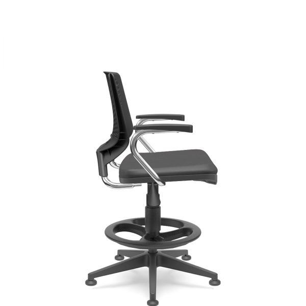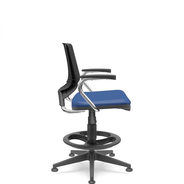 O design moderno da Beezi Caixa reflete-se no encosto e assento, desenhados para oferecerem ergonomia. Compostos em material termoplástico de engenharia, presente também nos apoios de braço, esse modelo da linha possui elevação e apoios para pés, indicados para bancadas mais altas e outras aplicações práticas que exigem acomodação em uma posição elevada.